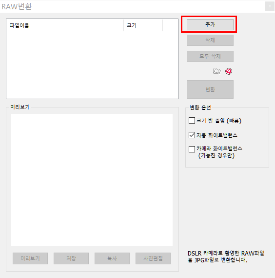 그럼 RAW 이미지 파일을 추가해서 JPG로 일괄 변경이 가능하며 변환시 화이트밸런스 자동보정을 통해 색상을 더 선명하게 저장할 수 있습니다.