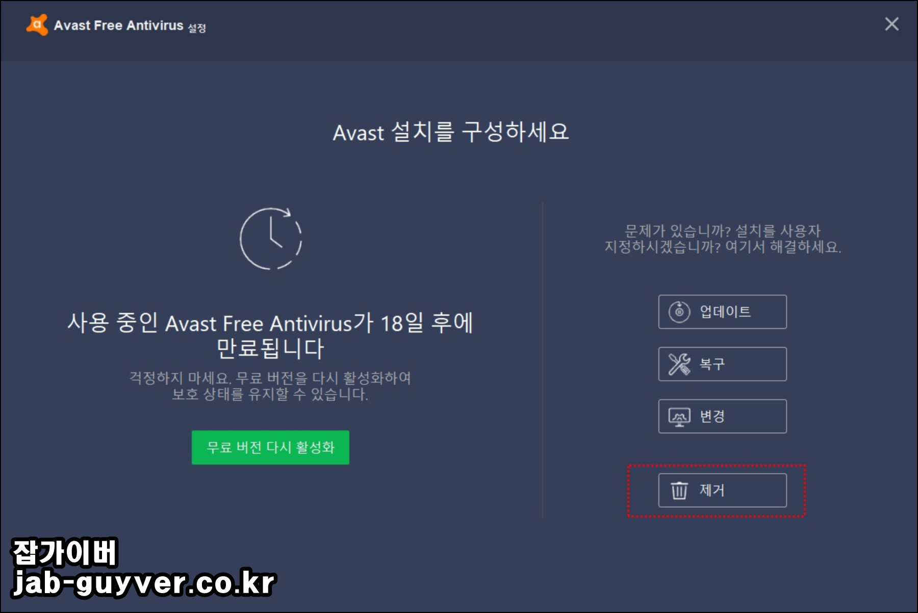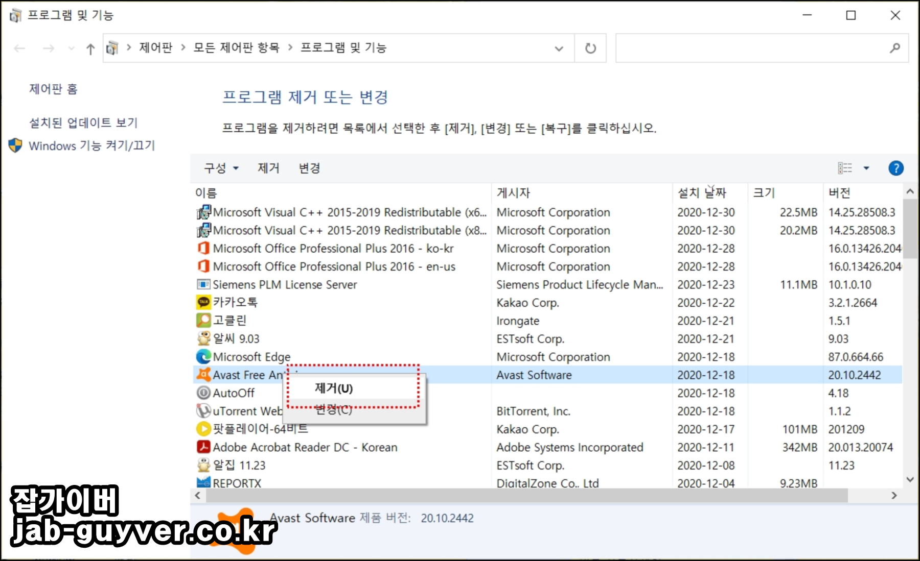 Avast 제거를 통해 프로그램을 삭제하거나 업데이트,복구,변경등이 가능합니다.