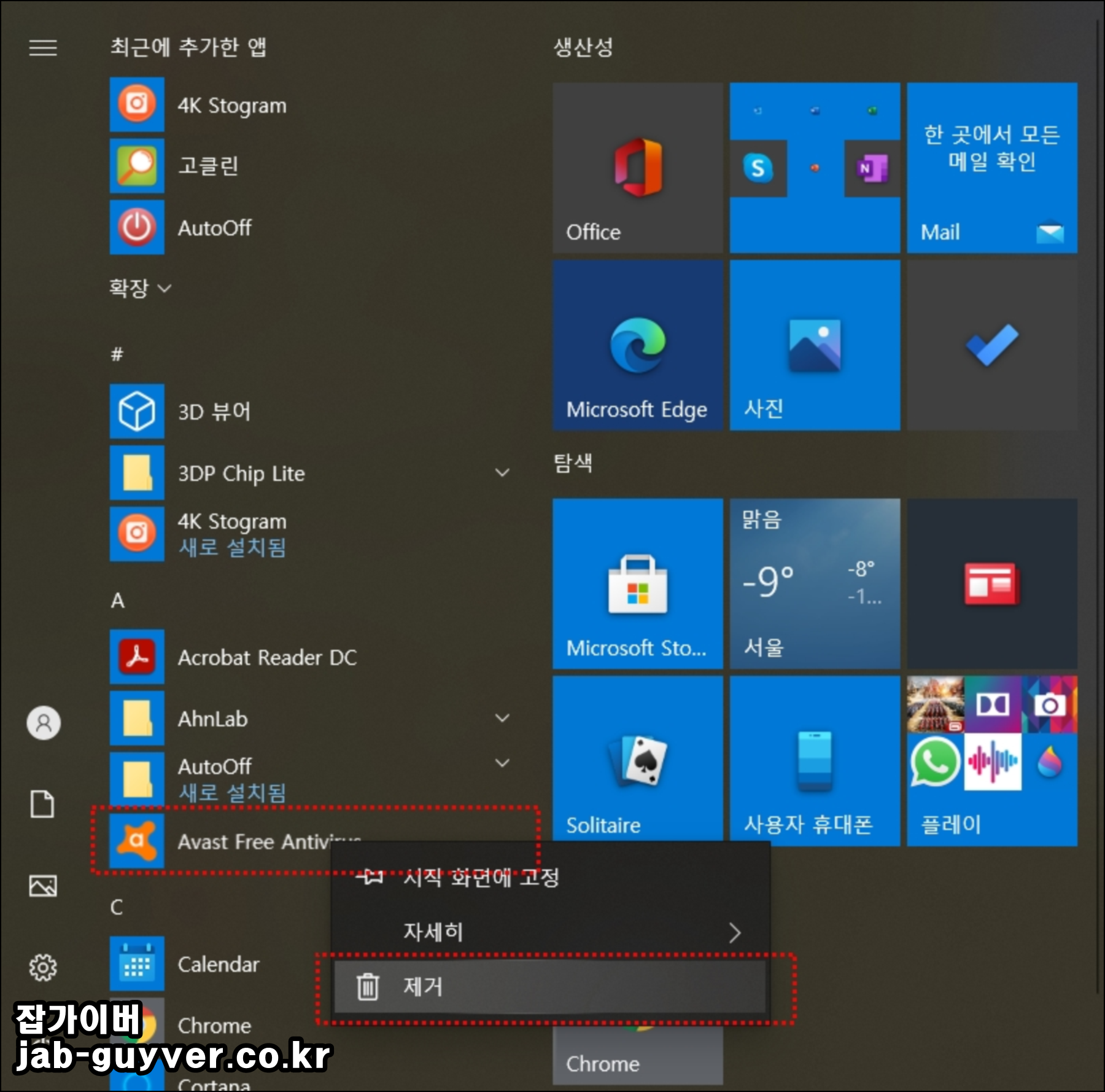 윈도우 로고를 클릭 후 Avast Free Antivirus 아이콘을 마우스 우클릭하면 제거 아이콘이 보입니다.