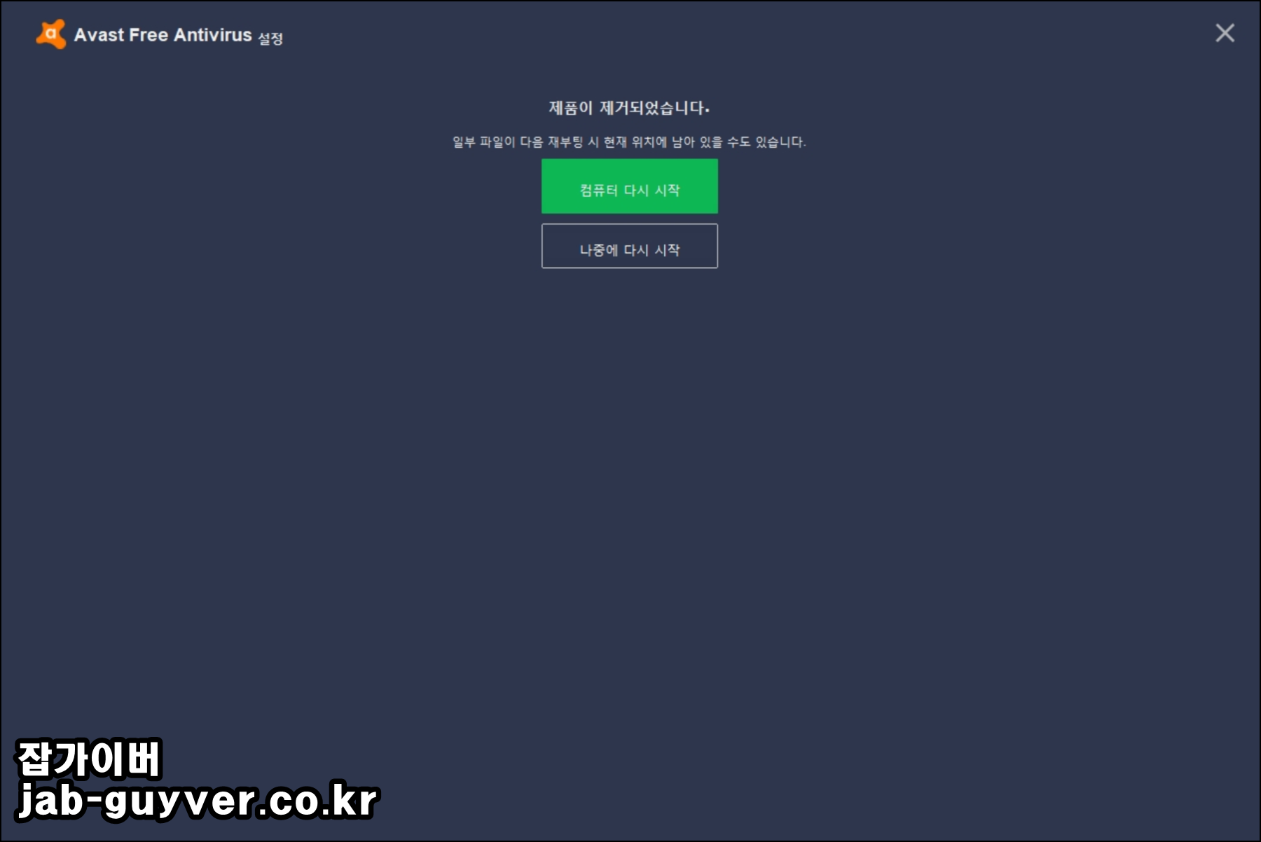 이후 어베스트 삭제가 완료되었다면 컴퓨터를 재부팅합니다.