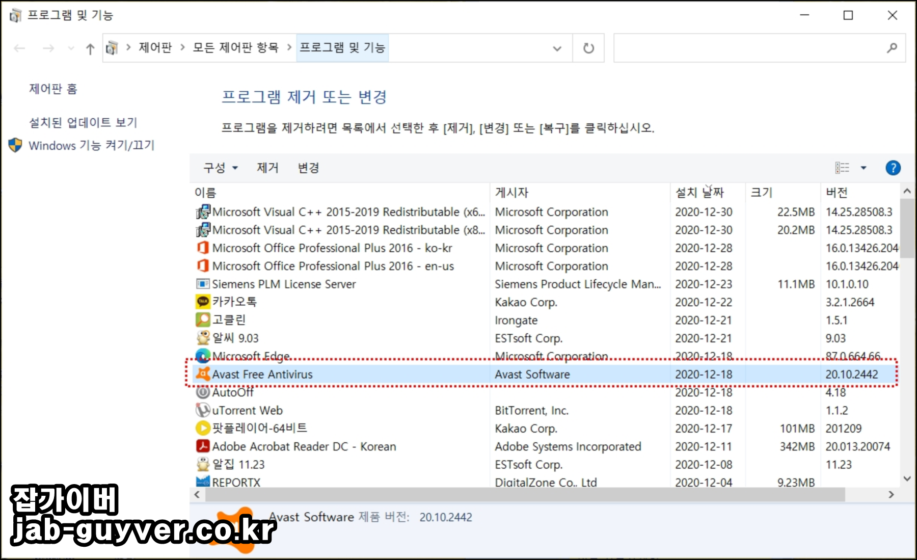 프로그램 및 기능탭으로 자동 이동되며 Avast Free Antivirus 파일을 찾아 삭제합니다.