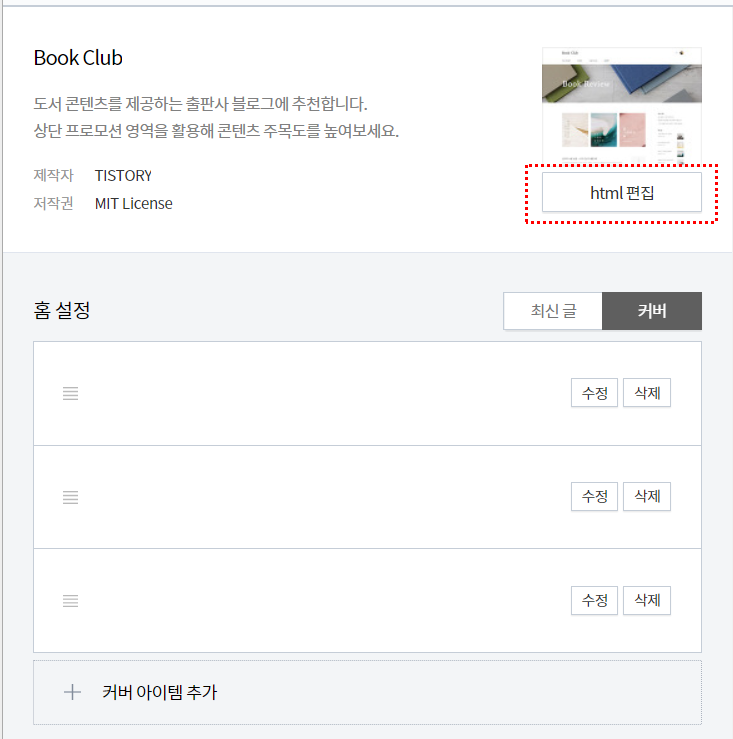 티스토리에서 스타일 CSS를 수정하기 위해서는 티스토리 - 꾸미기 - 스킨 편집으로 들어간 뒤 Html 편집으로 들어갑니다.