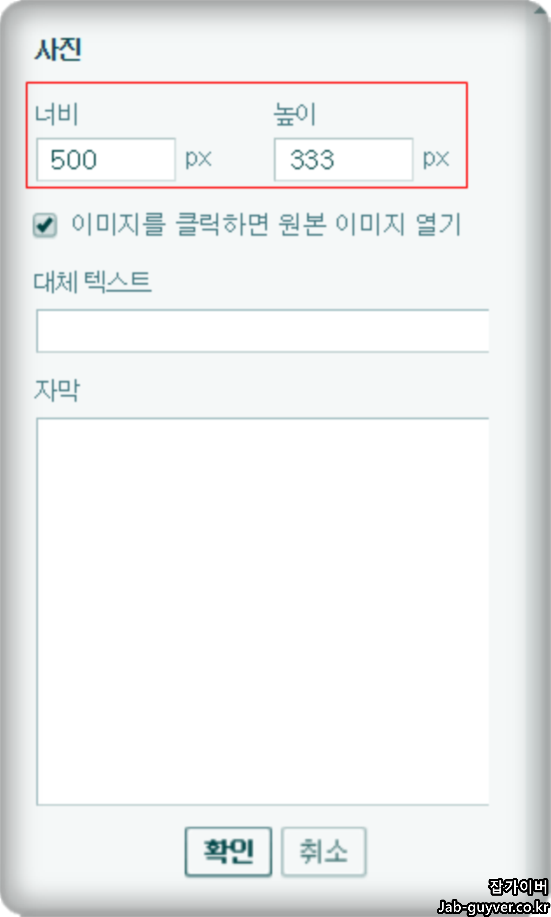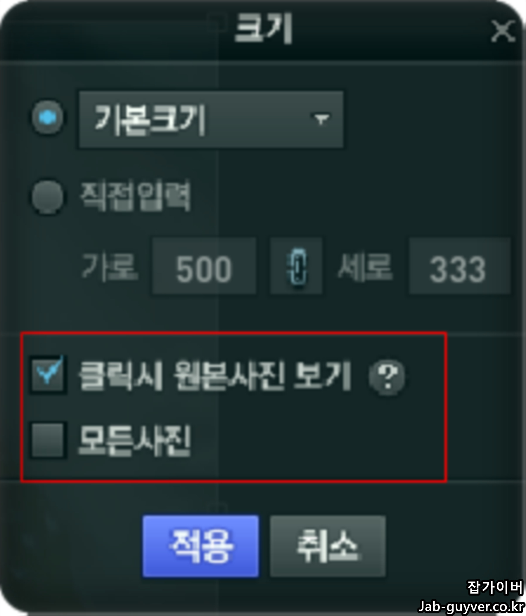 여기서 보이는 이미지의 크기를 직접 입력하여 수정할 수 있으며 원본 이미지를 원한다면 클릭 시 원본사진 보기 를 체크해줍니다.