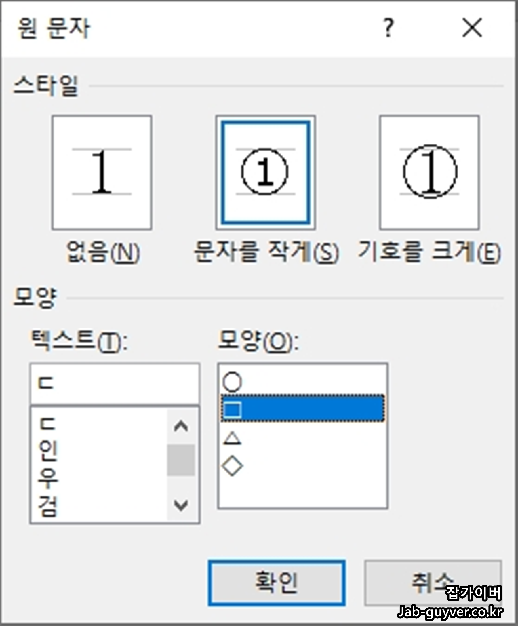 간단하게 문자를 작게 표시하는 방법과 기호를 크게 표시하는 방법이 있으며 모양으로는 동그라미부터 네모 세모 마름모등을 제공합니다.