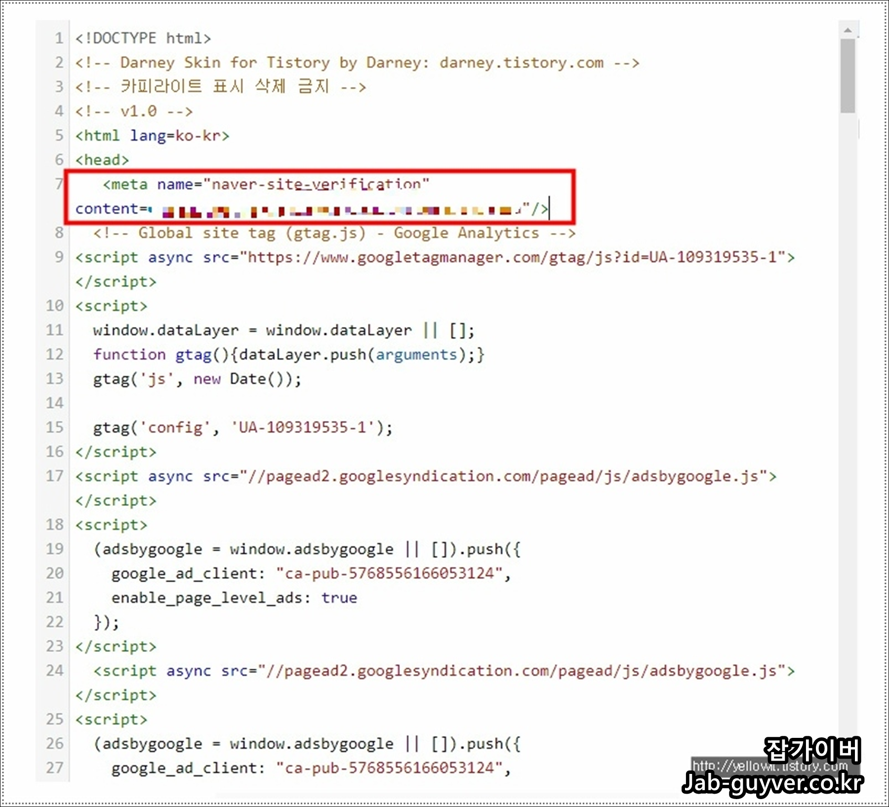 보는 것과 같이 제일 상단에 보면 <HEAD> 부분이 보입니다. 처음 하는 분들은 HEAD 위치를 찾는 걸 어려워하는데 제일 상단에 <HEAD> 바로 아래에 넣어주면 됩니다.