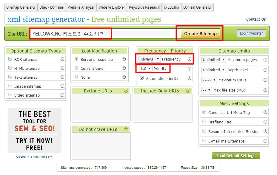 Frequency - Priority 체크항목에 Always (항상) 으로 체크 1.0 Priority 로 변경 후 Create Sitemap 클릭하면 홈페이지 크기에 따라 소요시간은 다르지만 사이트맵이 생성됩니다.