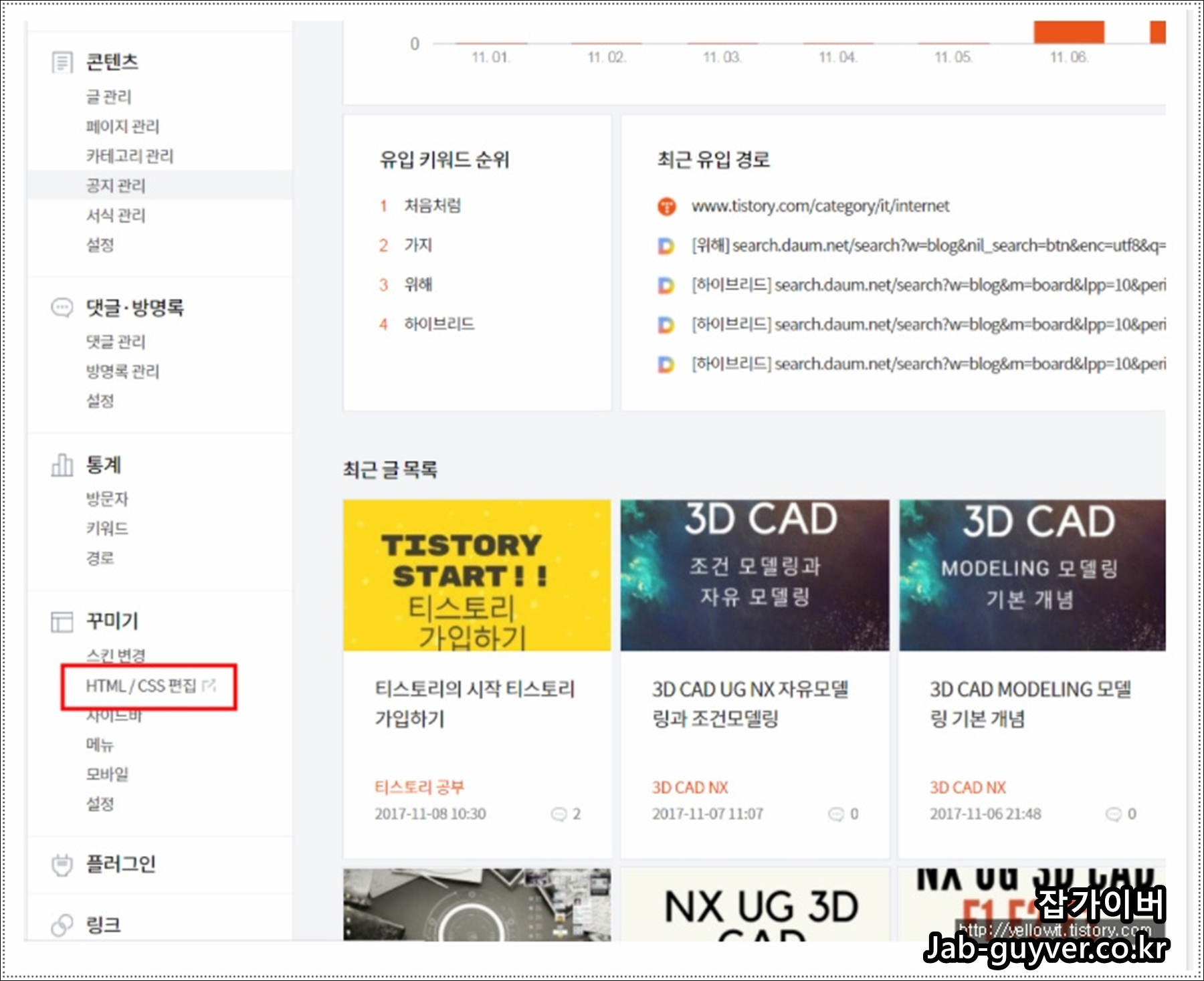 이러한 애널리틱스를 연동하게 되면 내 티스토리의 방문자 수와 방문 키워드 그리고 유입 키워드 등을 확인할 수 있어 홈페이지 관리에 초점을 잡는데 도움이 됩니다.