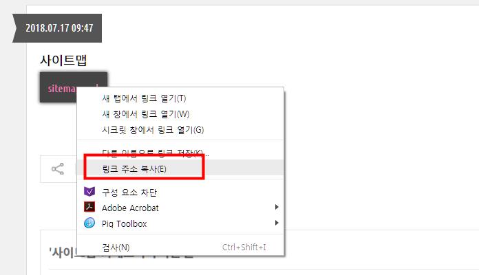 업로드한 사이트맵 파일을 우클릭 후 링크 주소 복사 합니다.