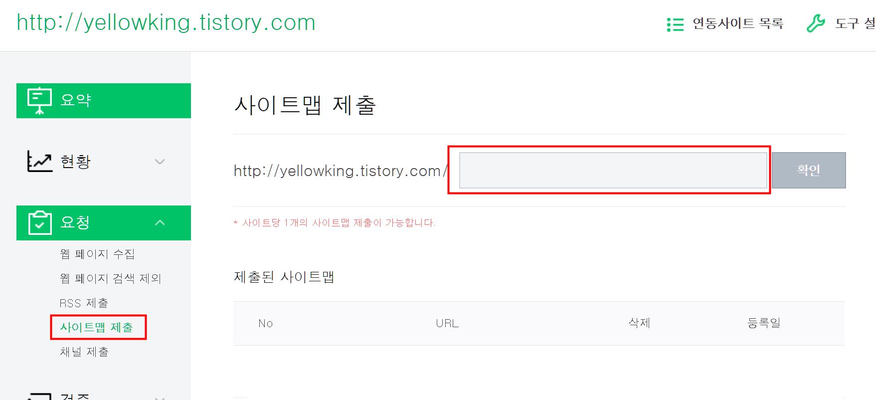 다시 네이버 웹마스터도구로 돌아와 요청 -> 사이트맵 제출에서 아까 복사한 링크주소를 티스토리 주소를 제외하고 붙여넣기합니다.