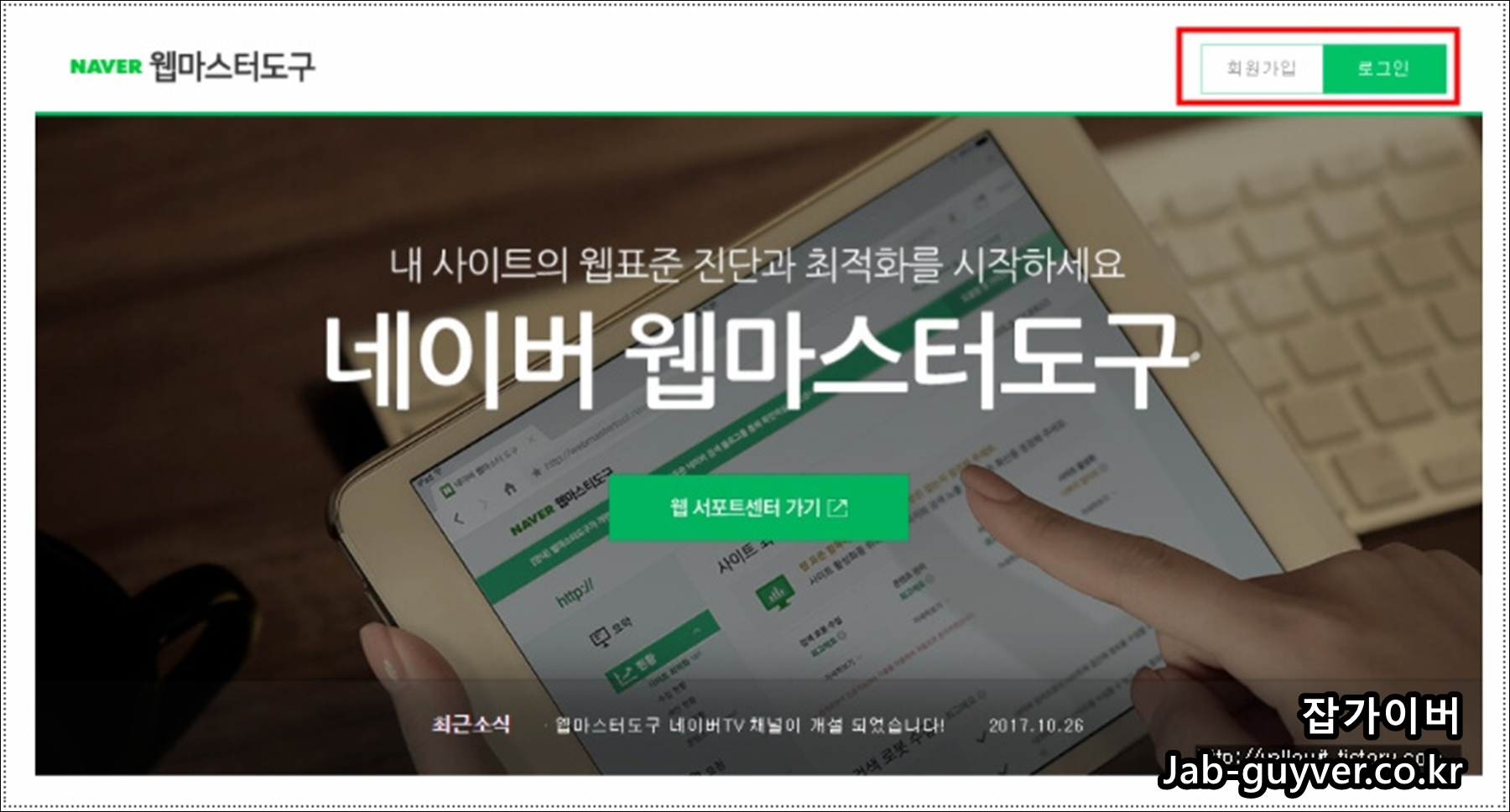 네이버 검색엔진에 등록하기 위해서는 네이버 웹마스터 도구에 접속 후 로그인합니다.