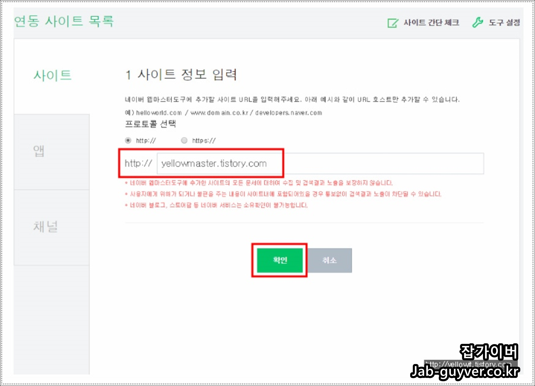 기본적으로 예전의 티스토리는 SSL 보안 인증서 (HTTPS)가 지원 안되므로 HTTP://로 체크 후 티스토리 주소를 입력했어야 했지만 2018년 9월부터 티스토리도 HTTPS가 지원되기 때문에 자신의 도메인에 맞는 프로토콜을 선택합니다.