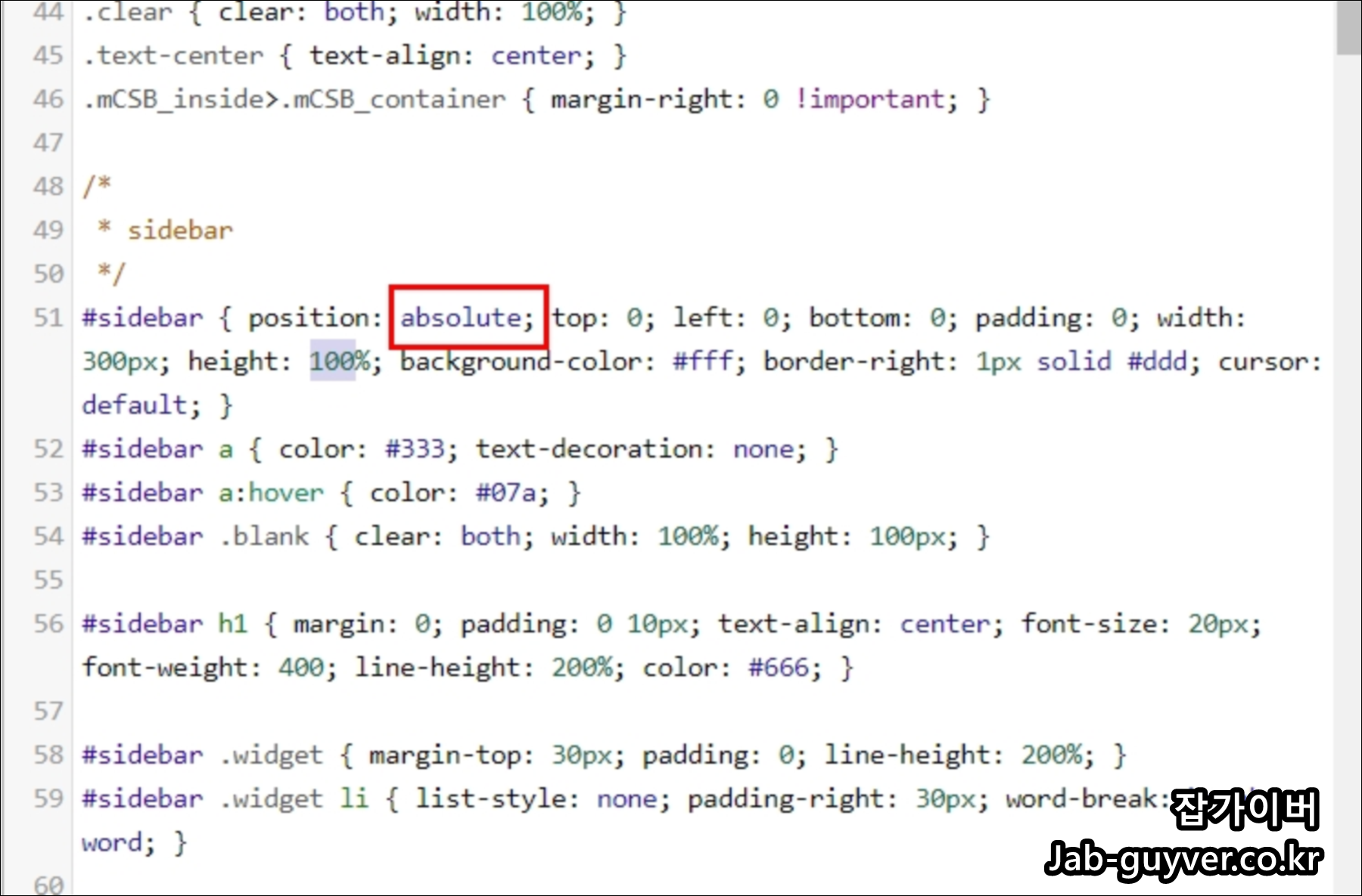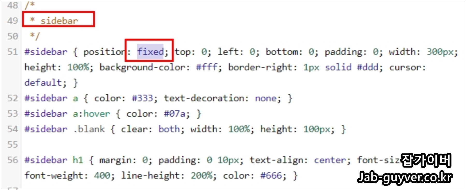 사이드바의 고정 및 크기/거리/위치를 수동으로 더 세밀하게 잡고 싶다면 아래 CSS를 참고해서 수정합니다.