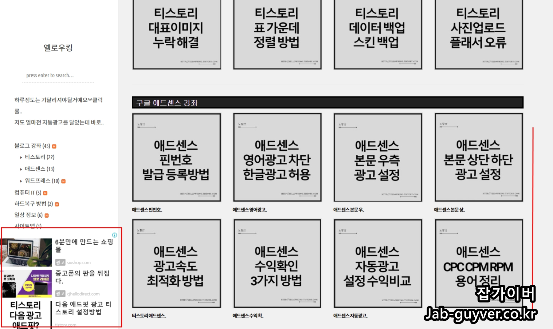 티스토리의 사이드바 왼쪽 하단에는 광고가 나열되어 있습니다. 이제 마우스 휠을 이용하여 포스팅을 내려보겠습니다.