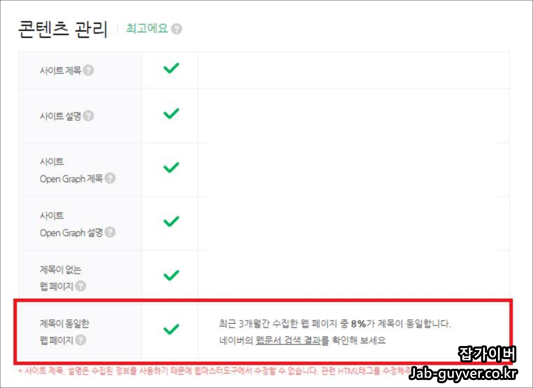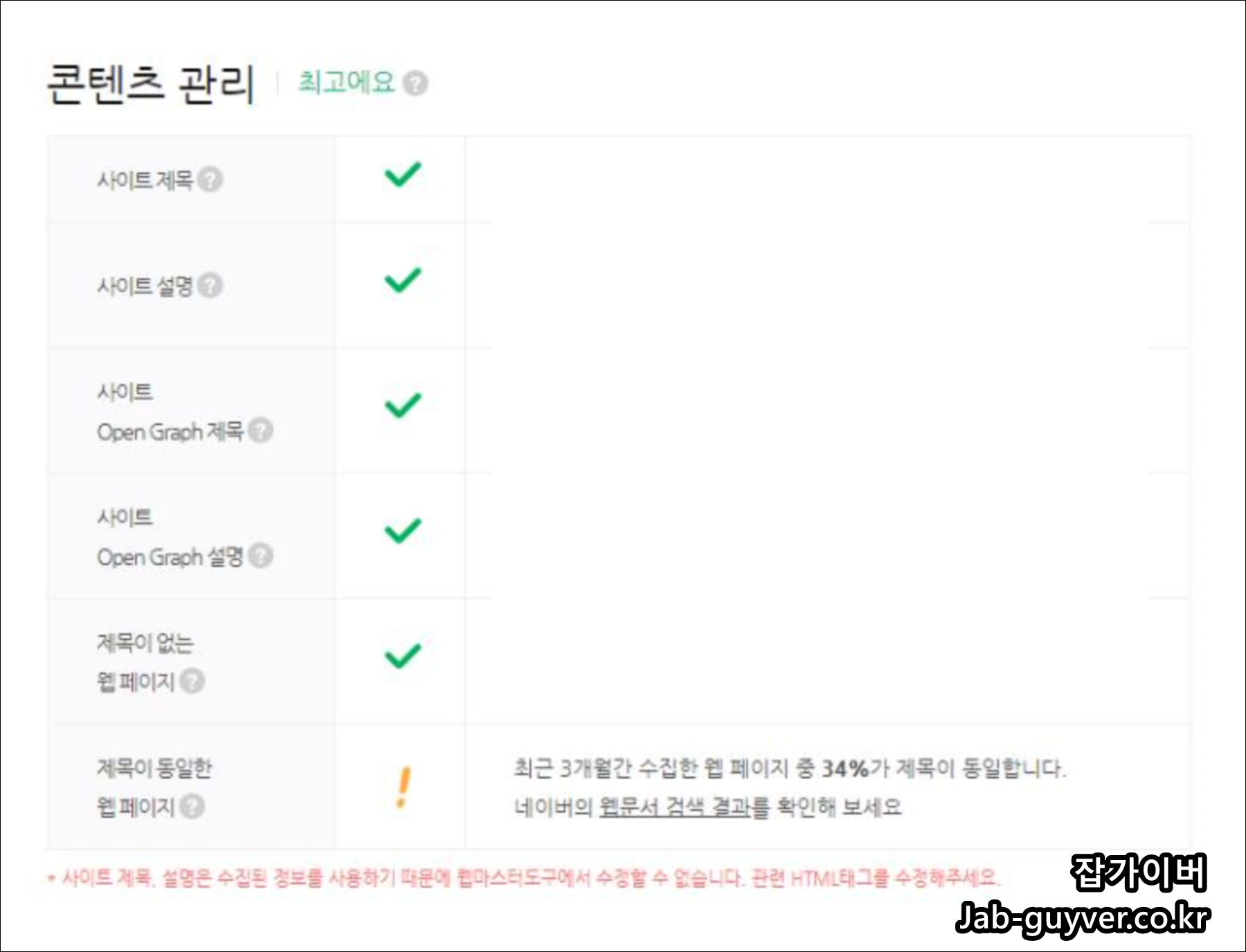 그렇기 때문에 각각의 검색엔진에서 부합하는 내용을 찾아보고 개선사항이 표시된다면 수시로 공사를 수정해야 하며 대부분 네이버 검색엔진에서 사이트 제목이나 사이트 설명 등을 작성해주는 것에는 문제가 되지 않지만 문제가 자주 발생하는 부분이 바로 제목이 없는 웹페이지 제목이 동일한 웹페이지 그리고 HTML 구조나 링크 관리 부분일 것입니다.