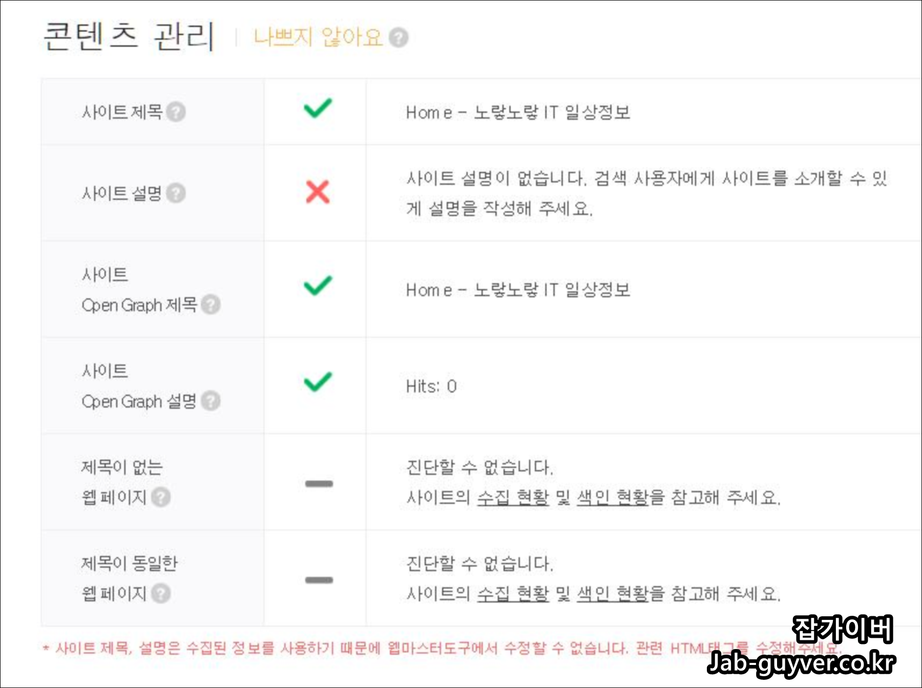 보는 것과 같이 네이버 웹마스터 도구에 사이트 제목과 사이트 설명 부분에 대해서 사이트 설명이 없음으로 표시됩니다.