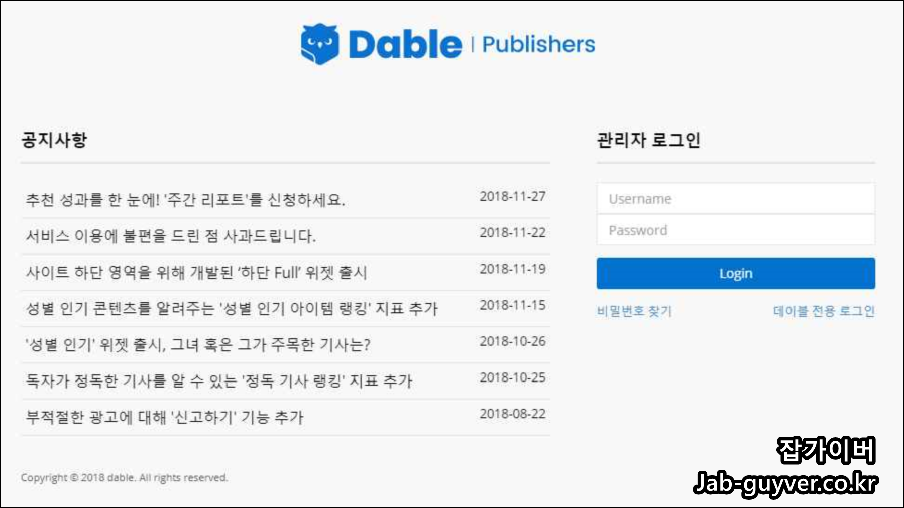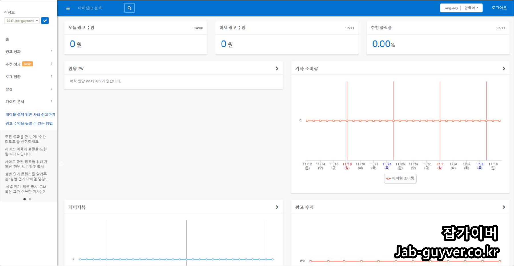 데이블 관리자 사이트로 접속 후 약관에 동의하면 데이블 관리자 사이트로 접속이 되며 여기서 광고 설정과 수익을 관리합니다.