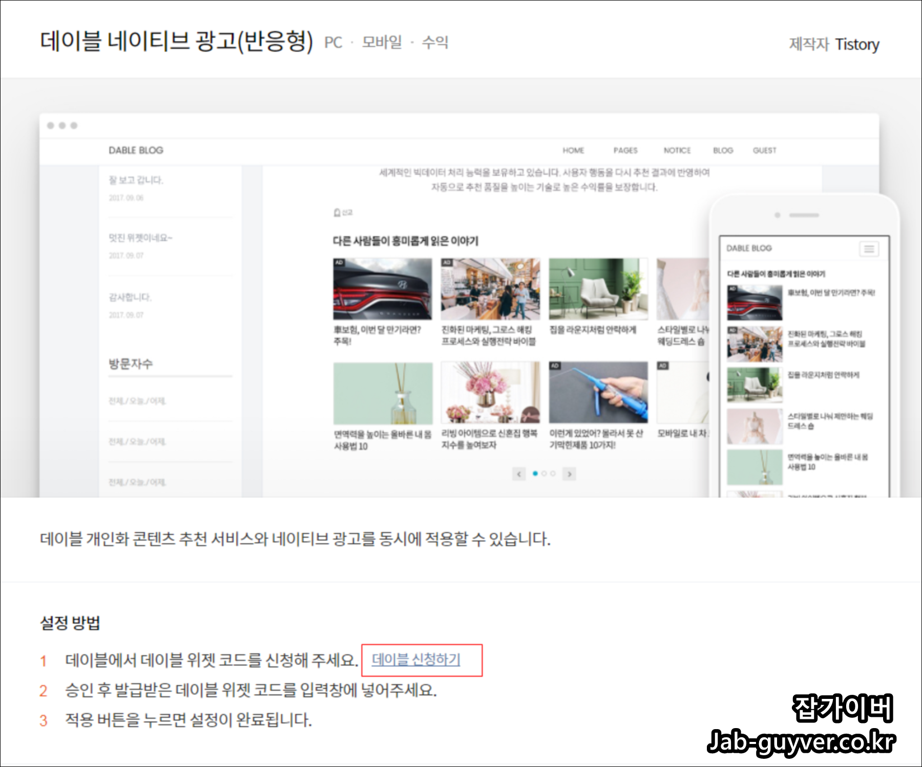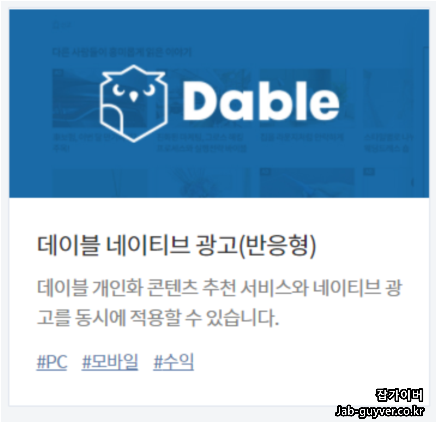 기본적으로 블로그 웹페이지 광고 플랫폼 중에서는 구글의 애드센스가 많은 인기가 있지만 국내의 데이블 광고도 티스토리와 연계하여 광고를 등록하기 쉽도록 제작되었습니다.