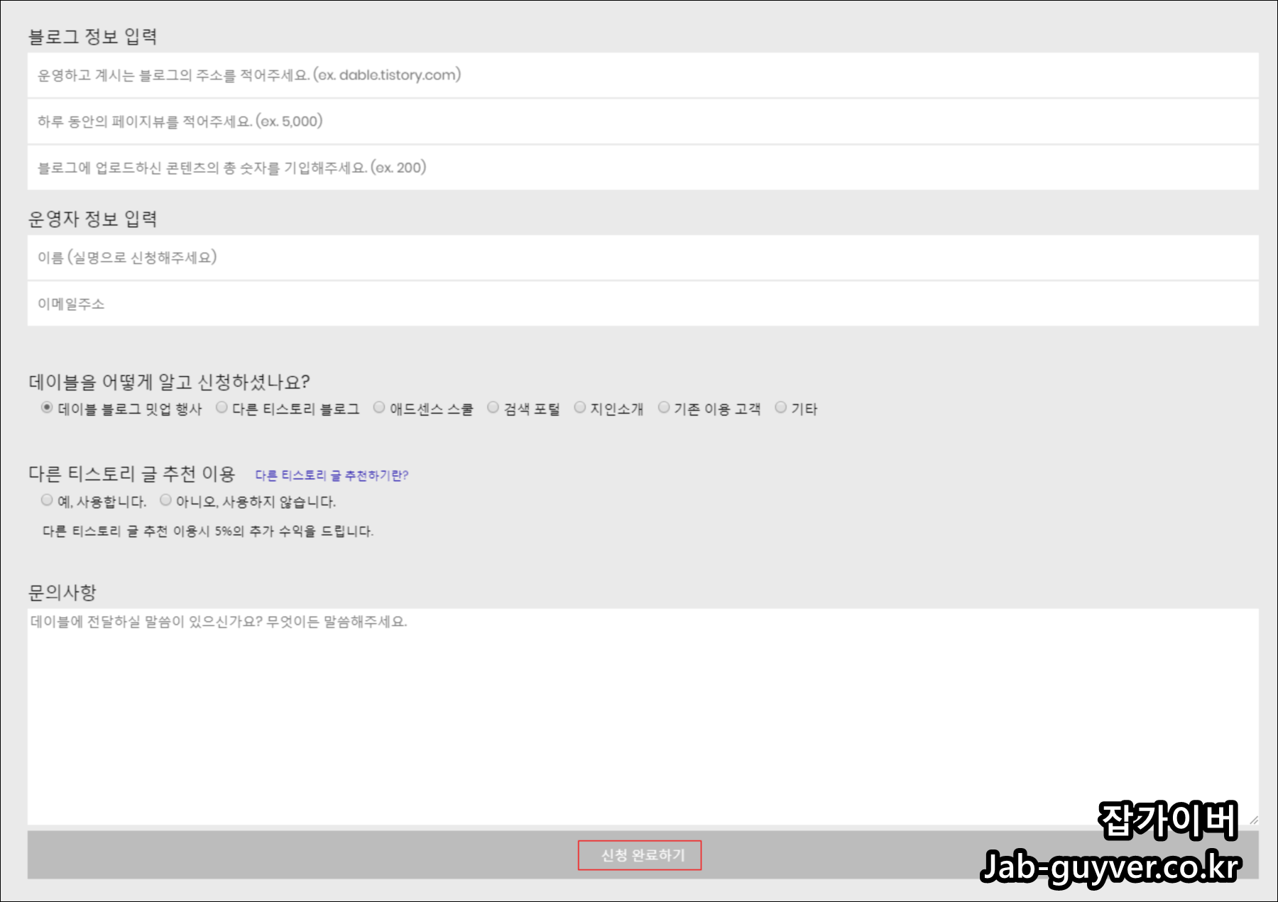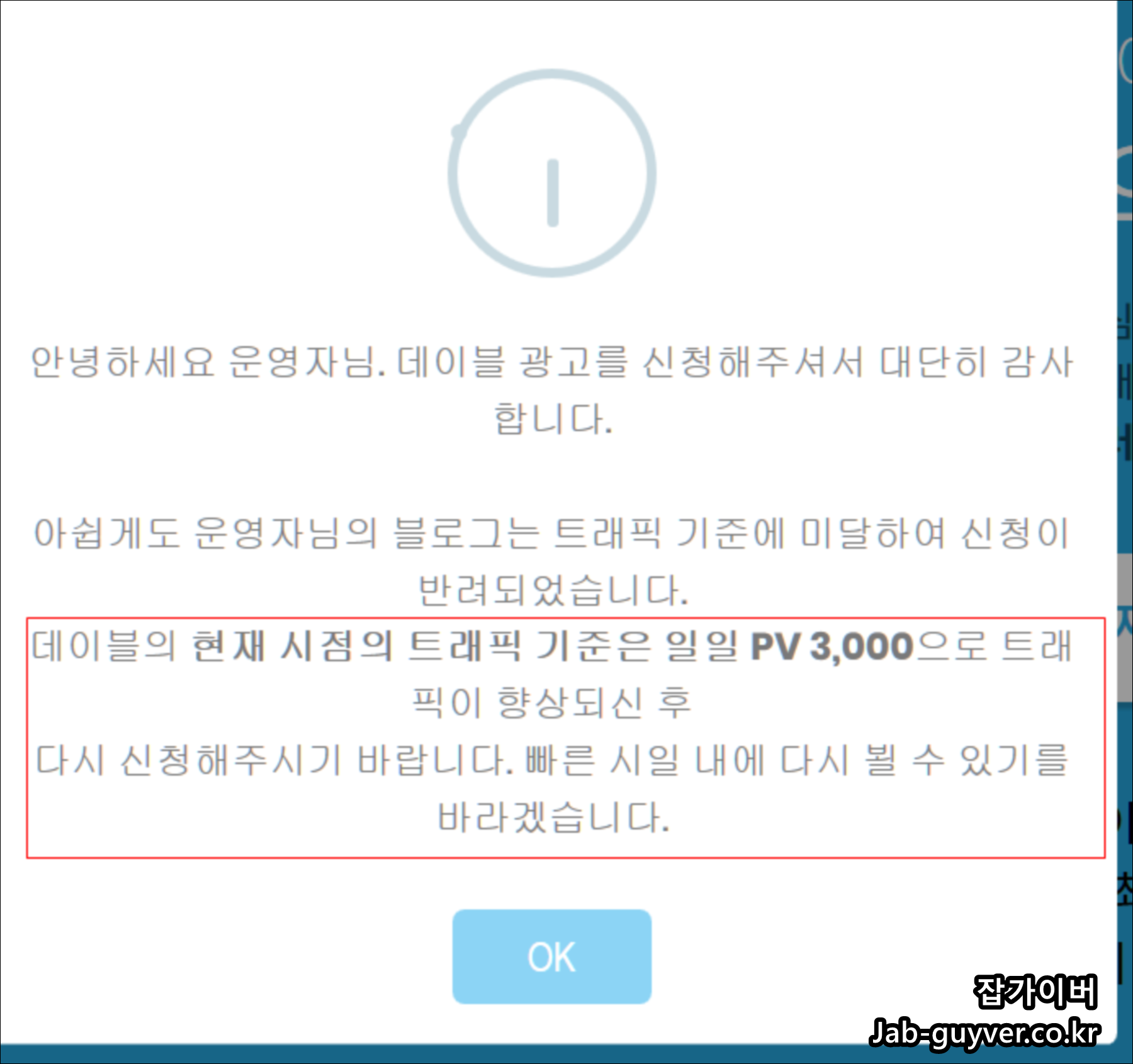 기본적으로 데이블의 가입 기준으로는 하루 페이지뷰가 3000 이상이 트래픽이 되어야 신청이 가능합니다.