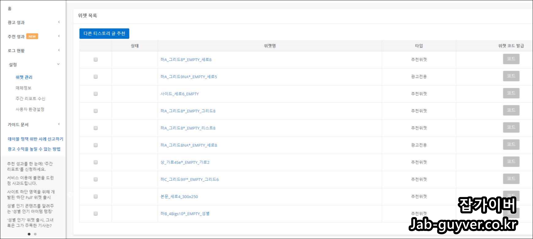 설정 - 위젯 관리에 들어가면 다양한 사이즈별 위젯 광고를 볼 수 있습니다.