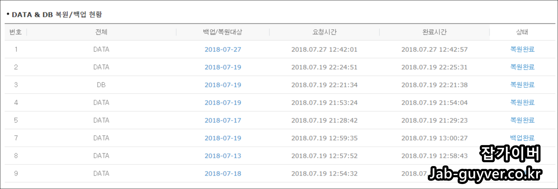 카페24에서 제공하는 백업 시스템에서는 DB(데이터베이스)와 DATA(파일)가 분리되어 관리됩니다.