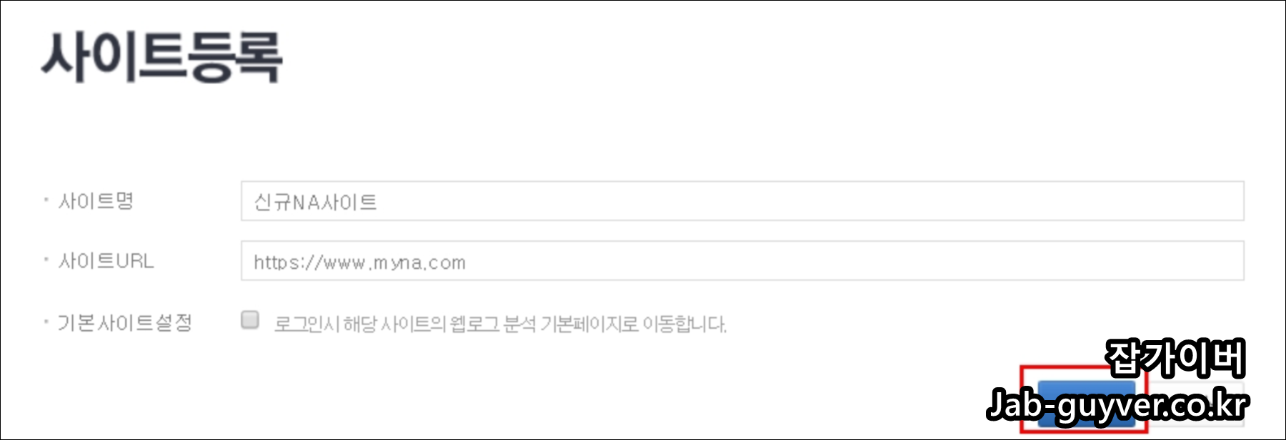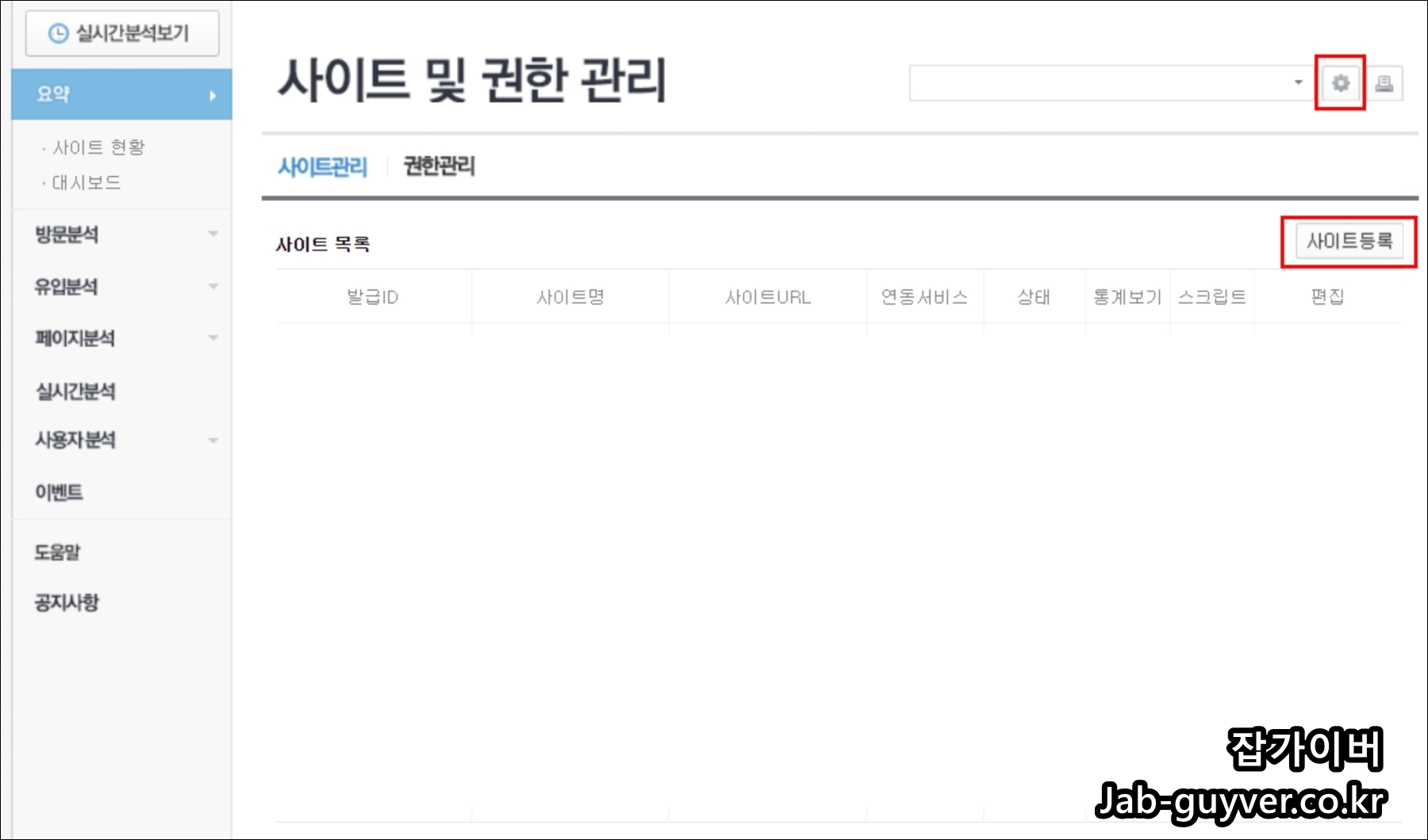 네이버 로그인 후 우측 상단에 바로 시작하기 버튼을 눌러주면 우측 상단에 기어 모양을 선택 후 사이트등록을 선택