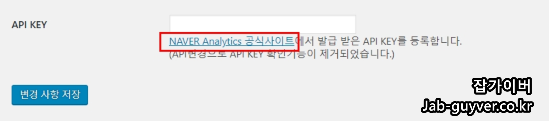 네이버 애널리틱스 플러그인이 설치된 워드프레스 테마에서 API KEY 입력 위치가 안 보여요. 어떻게 하나요?
