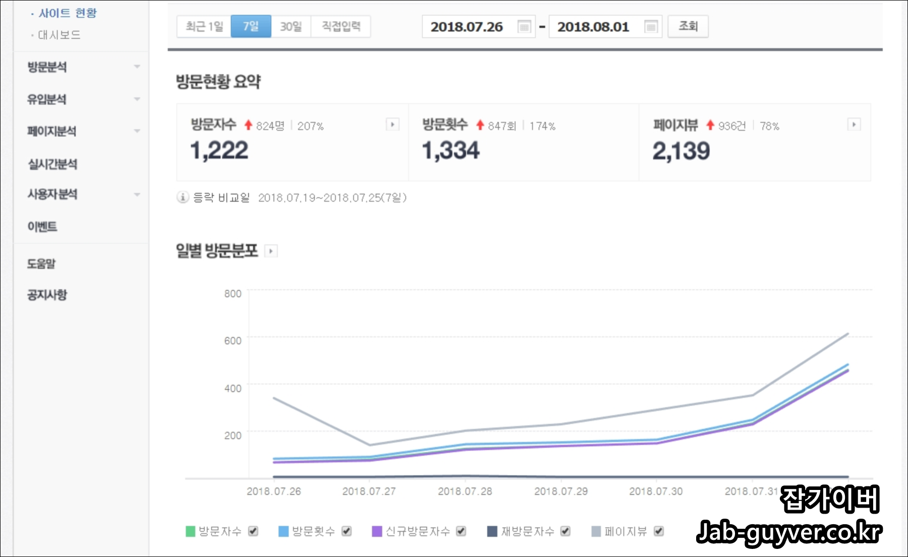 기본적으로 네이버 애널리틱스는 네이버에서 제공하는 웹페이지 분석툴로서 구글만큼의 다양한 기능을 제공하지 않지만 일반인들이 원하는 정보만 보기 편리하게 정리되어 있어 부담 없이 사용하는데 장점이 있습니다.