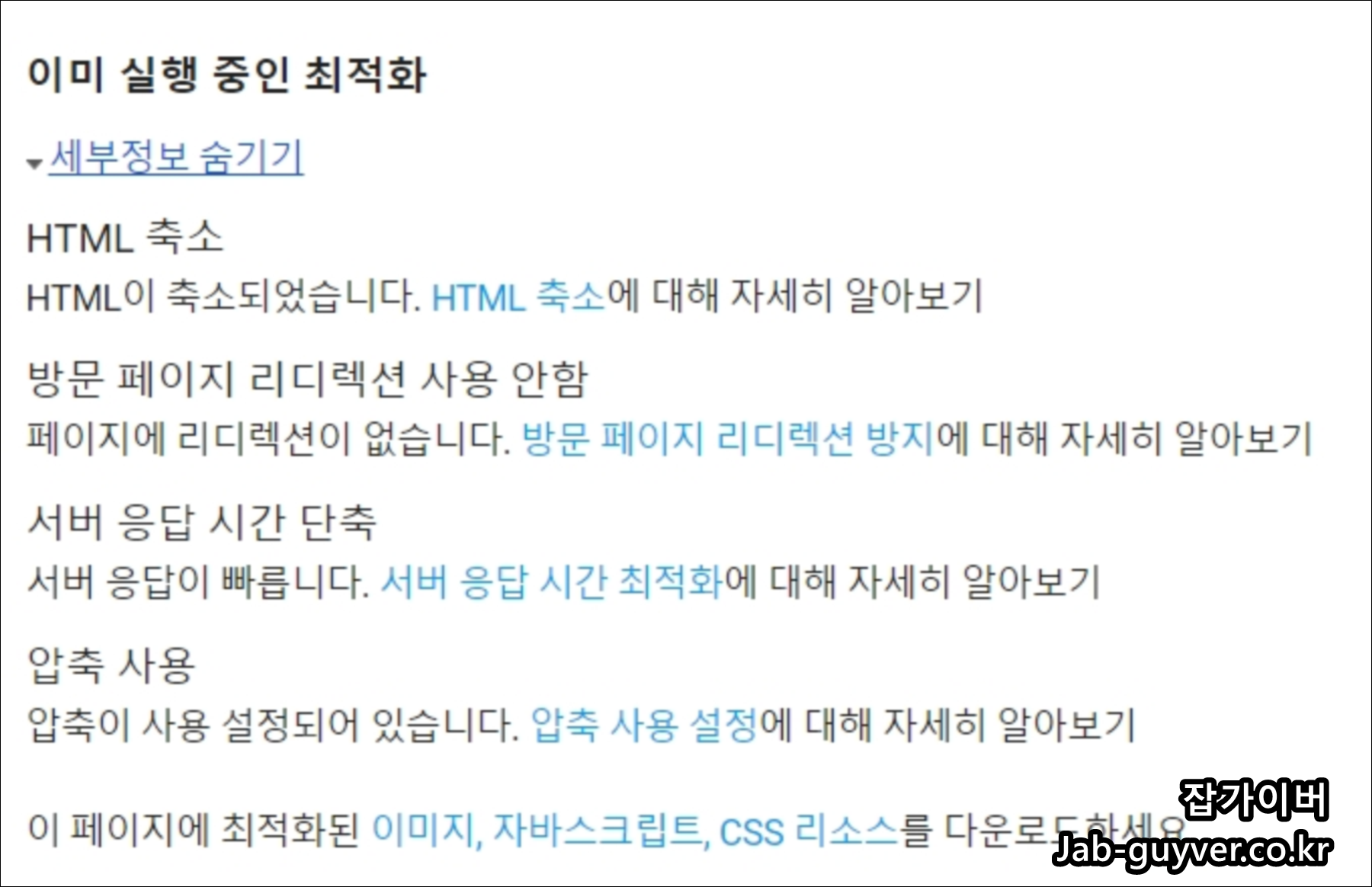 | 텍스트 압축 사용 | 서버·호스팅에서 Gzip 또는 Brotli 활성화 여부 확인 |