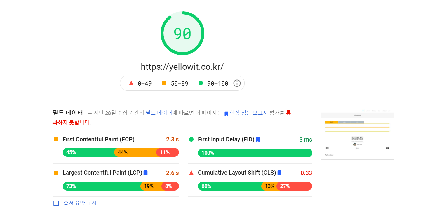 저는 데스크톱으로 접속 시는 속도가 꽤 충족이 되지만 모바일로 접속시 100점만 점 중에서 점수에 따라 빨간색, 노란색, 빨간색으로 현재 홈페이지 속도를 확인할 수 있습니다.