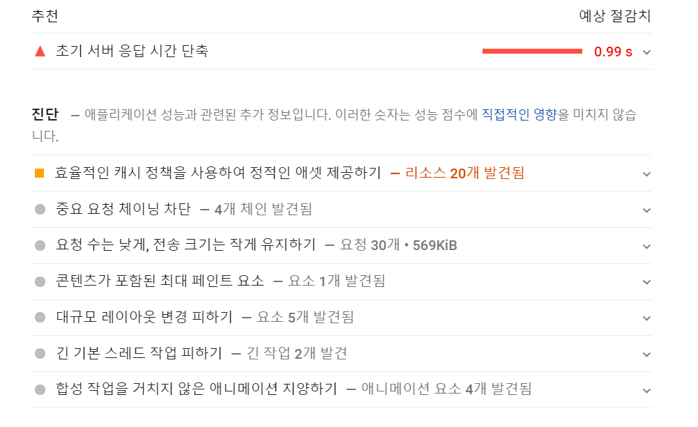 서버응답 시간의 경우 현제 0.81초 후에 응답하기 때문에 이러한 응답시간을 개선하라고하느데 개선방법도 클릭을 하면 해결방안이 나옵니다.