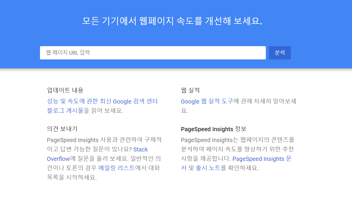 웹페이지 속도를 측정해주는 사이트는 많이 있으며 이번 2018년 7월 9일부터 구글의 페이지 속도 측정할 수 있는 PageSpeed Insights 사이트가 생겼습니다.
