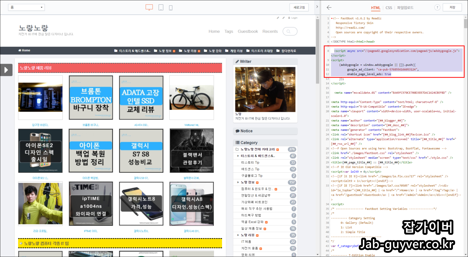 애드센스도 기본적으로 메타정보를 이요한 사이트 연결을 확인해야 하며 메타태그를 복사합니다.