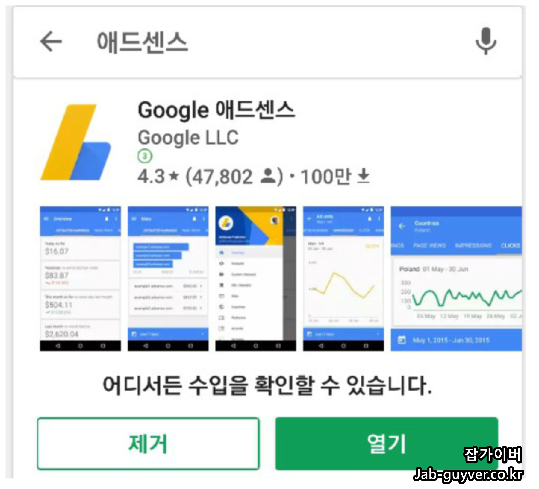 이동 중이나 장소에 제약 없이 수시로 언제 어디든지 내 광고수익을 확인할 수 있는 장점이 있으며 플레이스토어에서 "애드센스" 검색하여 애플리케이션을 다운로드하여 설치합니다.