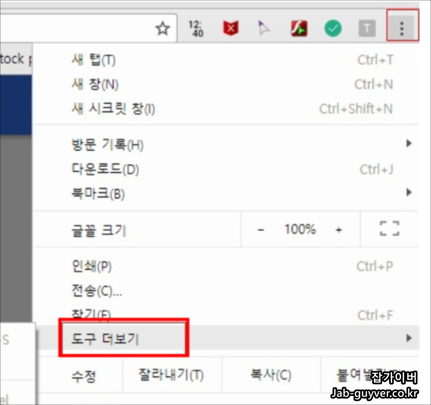1. 우선 구글 크롬으로 접속 후 우측 상단에 있는 점 3개를 선택 후 도구 더 보기를 선택합니다.