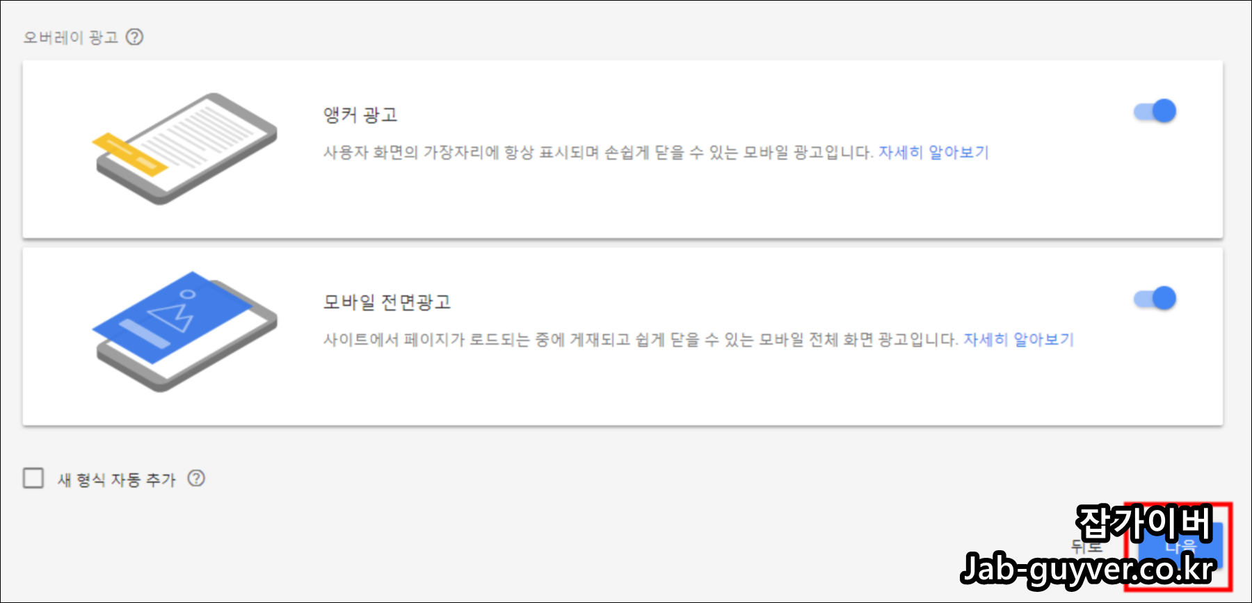 앵커 광고와 전면(비네트) 광고는 꼭 켜야 하나요?
