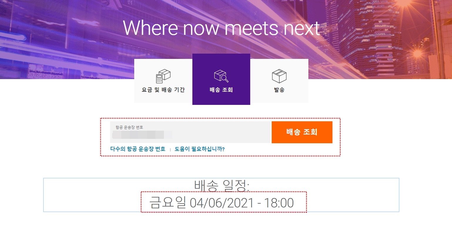 운송장번호를 입력 후 배송조회를 선택하면 배송 도착일정과 시간을 확인할 수 있습니다.
