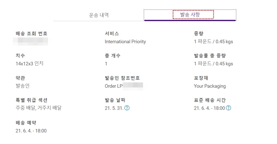 현재 페덱스 배송중인 물품의 서비스와 중량"무게"와 택배박스 크기 치수,갯수,발송인 참조번호,포장재,특별취급섹션,발송날짜,표준 배송시간,배송예약등을 확가능합니다.