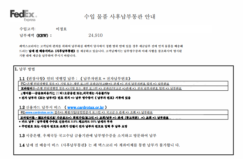 이때 관부가세 납부하는 방법은 크게 4가지가 있으며 가장 쉬운 방법은 택배사인 페덱스를 통해 관부가세를 대납 "대신 납부"하는 방법과 신용카드를 통해 할부납부가 가능합니다.