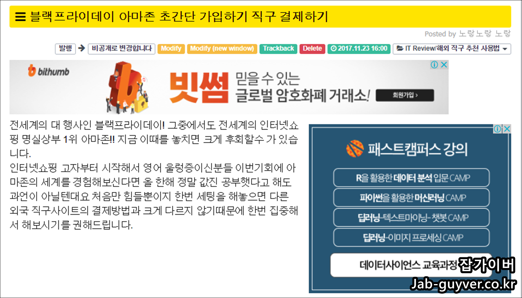 이후 일정 시간 이후 해당 포스팅을 확인해보니 상단과 본문 우측의 광고가 한글로 뜨는 것을 볼 수 있습니다.