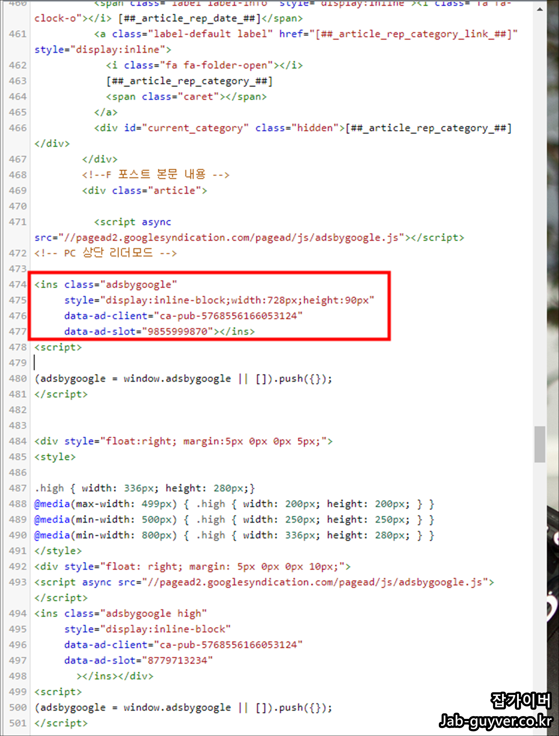그래서 HTML로 애드센스 광고를 삽입한 부분을 찾아 HTML 애드센스 광고 삽입방법을 모른다면 아래 포스팅을 참고하세요