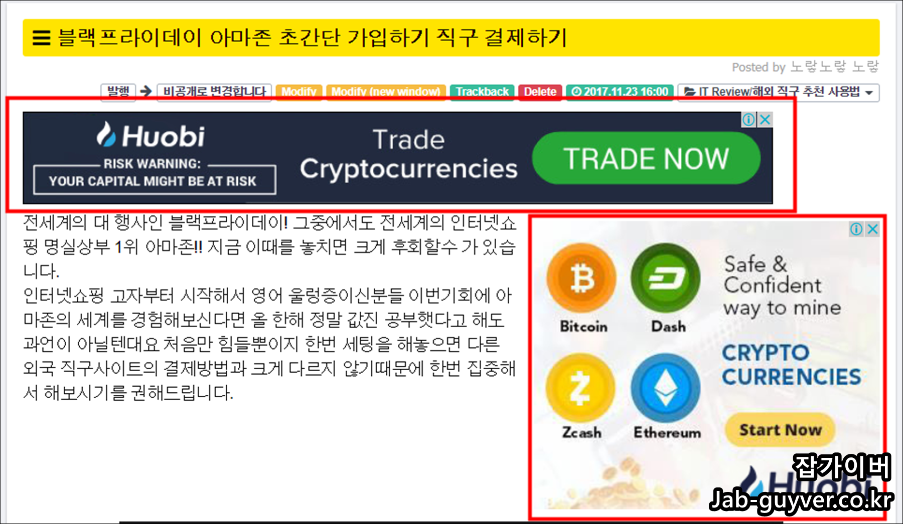 이후 일정 시간 이후 해당 포스팅을 확인해보니 상단과 본문 우측의 광고가 한글로 뜨는 것을 볼 수 있습니다.