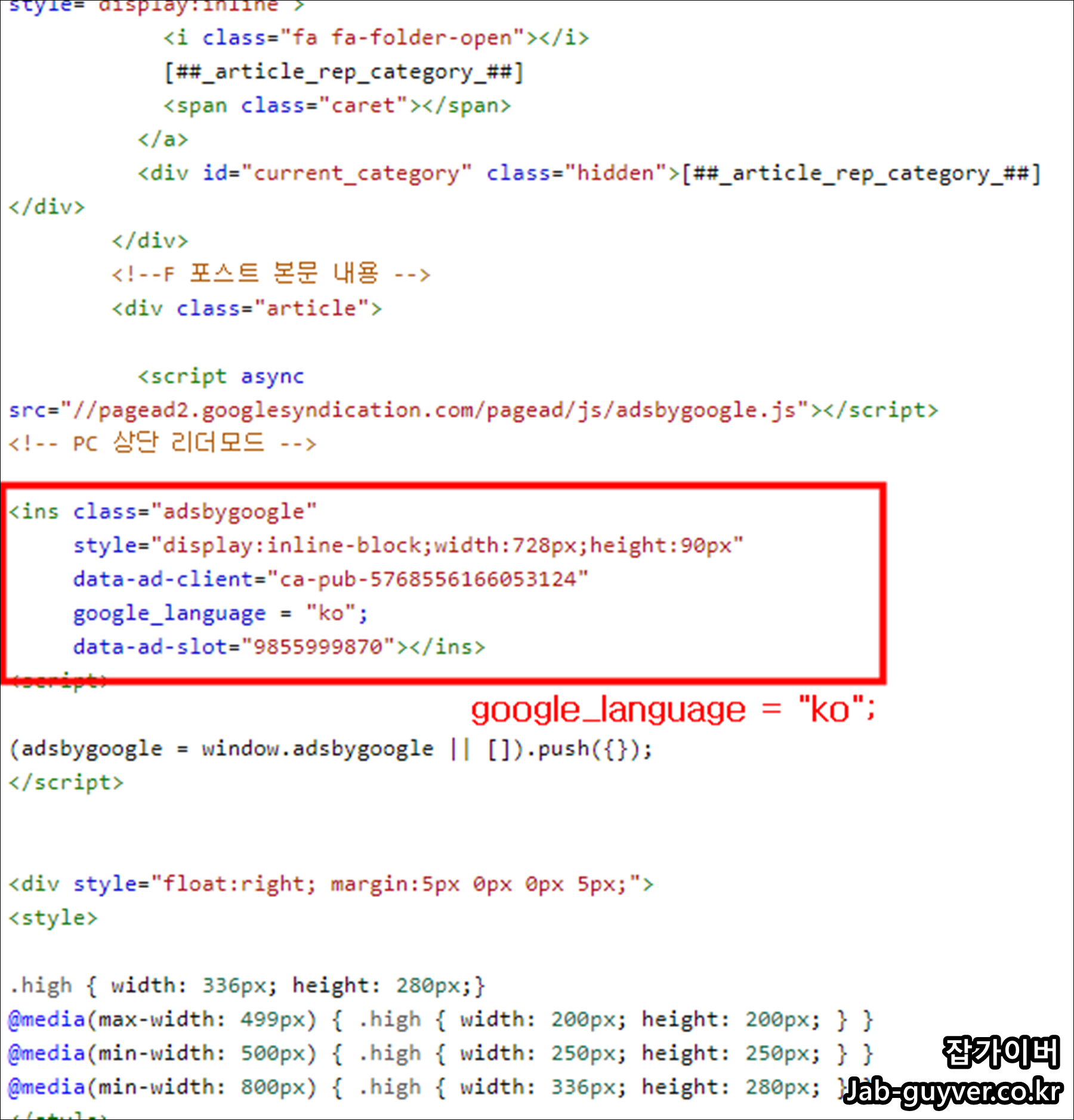 광고 코드를 보게 되면 하단에 아래 언어 명령어를 추가합니다.