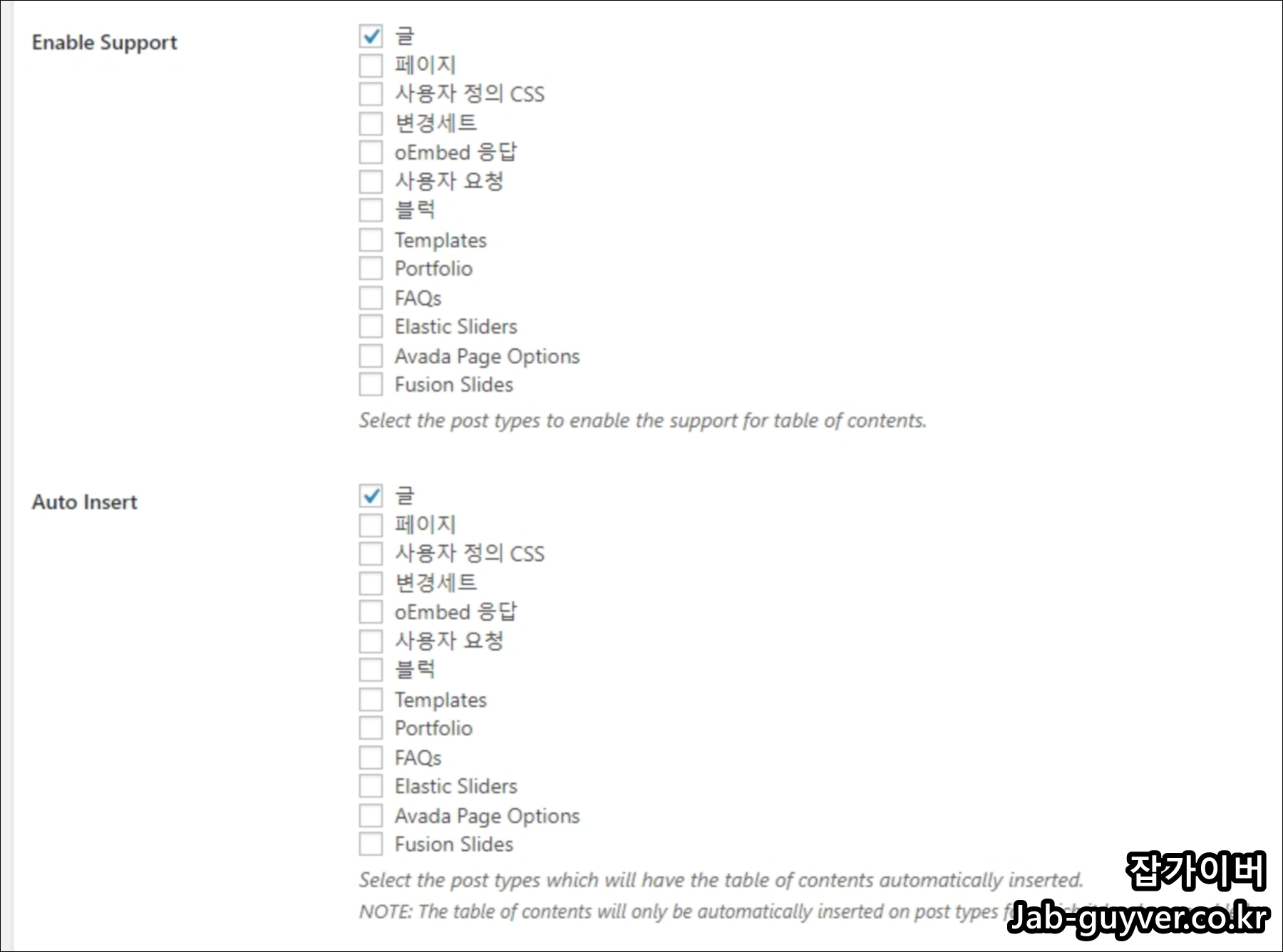 Easy Table of Contents 플러그인을 설치 후 옵션을 살펴보면 목차를 사용하고 싶은 콘텐츠를 선택할 수 있습니다.