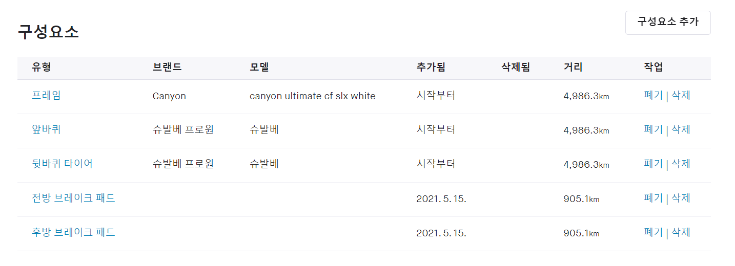 기본적으로 등록할 수 있는 자전거 구성요소는 아래와 같습니다.