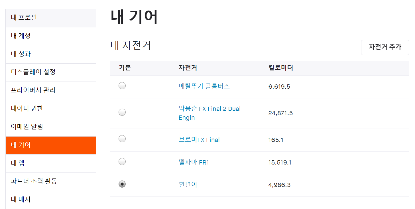 스트라바 -> 설정 -> 내기어로 들어가면 자신의 자전거를 여러대 등록해서 해당 자전거로 로그를 올리면 자동적으로 마일리지가 킬로미터 단위로 등록됩니다.