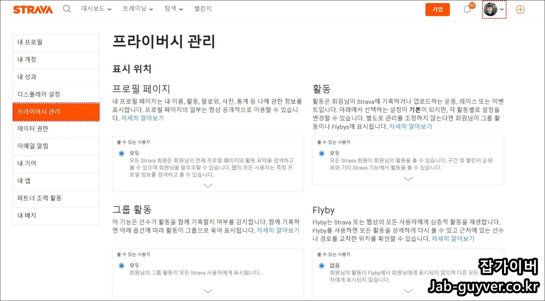 이를 통해 현재 자신의 스트라바 프로필이나 활동,그룹활동,Flyby등을 공개할 것인지 비공개할 것인지 선택할 수 있습니다.