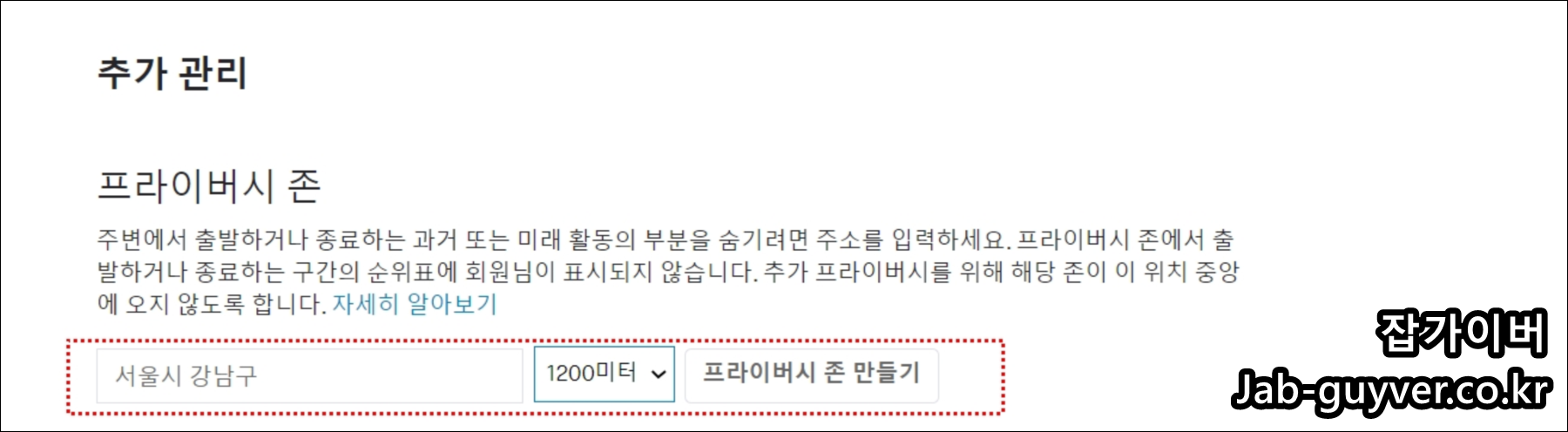 그리고 프라이버시 존 설정을 통해 주변의 출발지나 종료지점의 반경거리에 따라 숨기도록 설정할 수 있습니다.