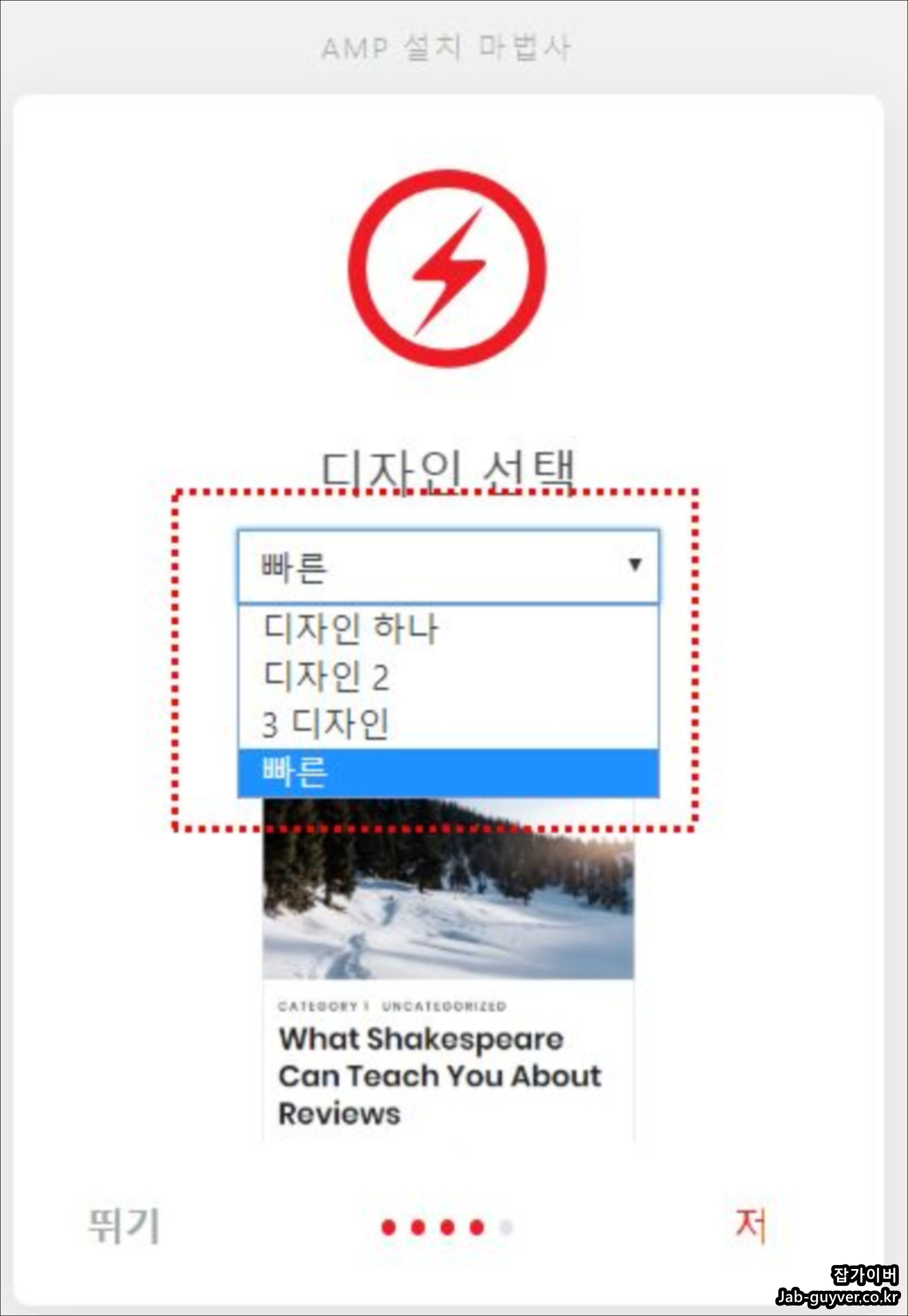 디자인 탭에서는 AMP 전용 테마를 고를 수 있는데, 무료 테마만으로도 4가지 정도 스타일을 지원합니다.