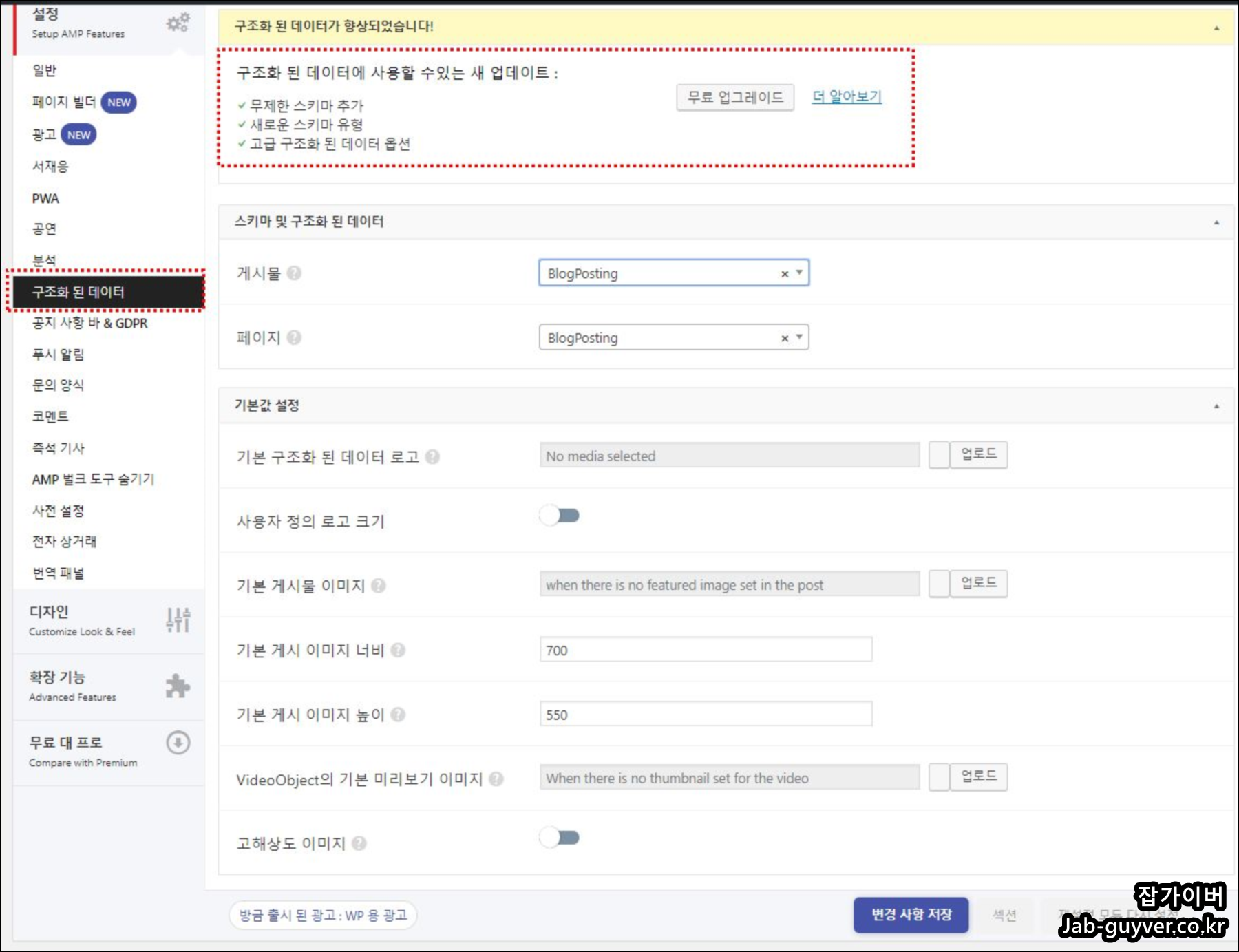 구조화 데이터(스키마) 기능도 제공하는데, 글이 리뷰인지, 레시피인지, 일반 기사인지 타입을 지정해 주면 검색 결과에서 별점이나 썸네일이 더 풍부하게 보여질 수 있습니다. SEO 플러그인에서도 스키마를 지원하지만, AMP 버전에도 제대로 반영되는지 한 번은 확인해 보는 게 좋습니다.