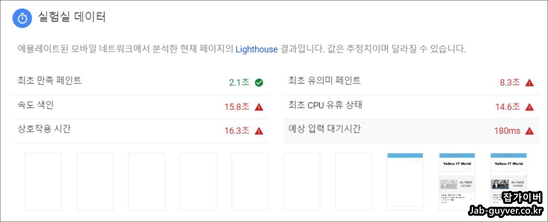 | 자바스크립트 실행 시간 | 필요한 스크립트만 남기고 나머지는 지연 로딩을 적용합니다. |